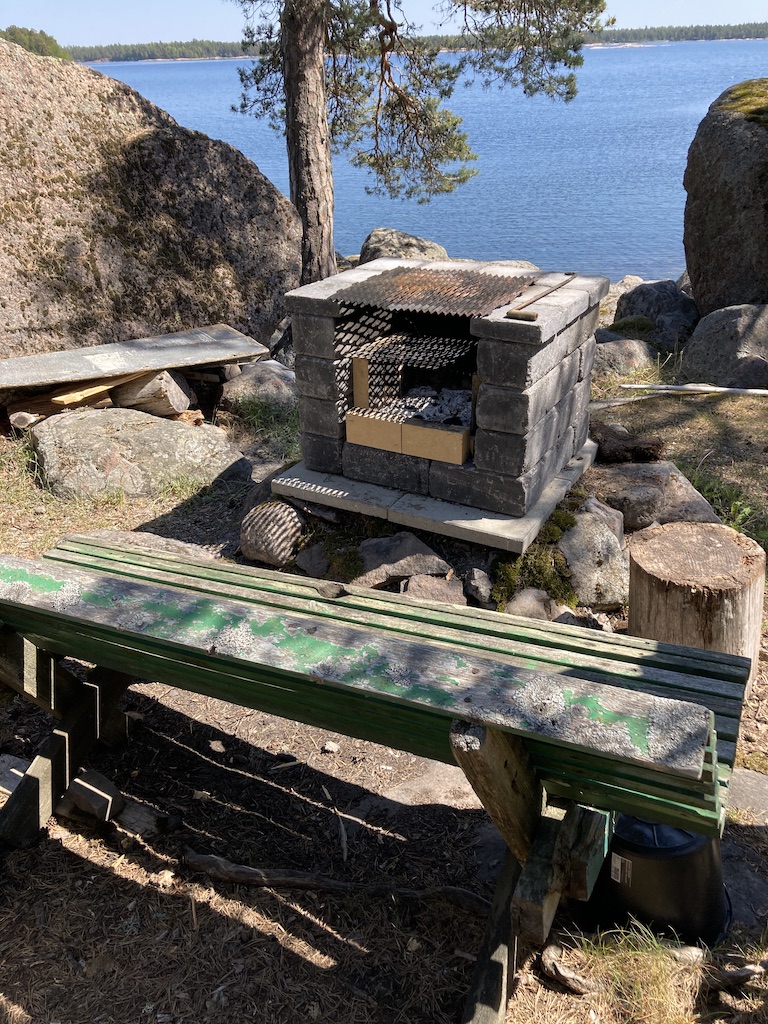 Tutustuminen saareen tehtiin tällä kertaa lounaisosaan saarta, jossa emme aiemmin ole käyneet. Matkalla ohitimme uutuuttaan ”hohtavan” grillin. Vanhat osat jo melein hajonneesta oli tämän uutukaisen takana. Huolella kasattu puunpolttolaitos. Kyllä tuossa kelpaa makkaransa kärventää. Vanha puistonpenkkissä on hyvä vahtia syötäviään ja tarkkailla ohikiitäviä veneitä. Keskikesällä liikennettä varmasti onkin, koska tästä editse menee pienveneväylä.