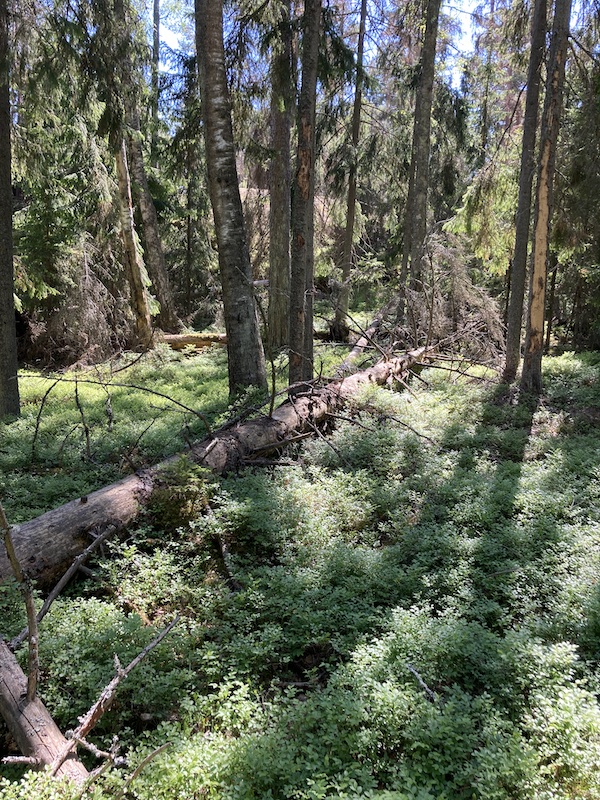 Melkein umpeen kasvanut polku kulki melkoisen aarniometsäisen maiseman halki mutta johdatti kuitenkin meidät toiselle puolelle saarta. Onneksi ei ollut risteäviä polkuja, joten ei tarvinnut arpoa, mihin kävelisimme.