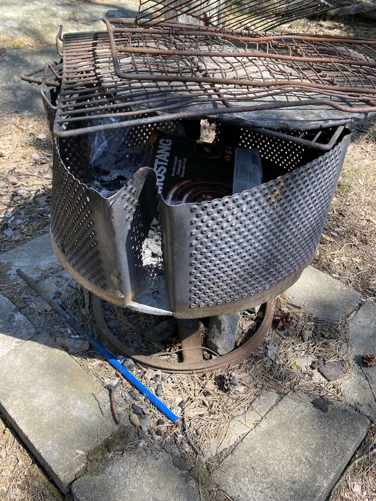 Siellä oli leiripaikka, jossa sellainen tusija jollaista en ole ikinä nähnyt. Onhan pesukoneen rumpua käytetty jopa sumppuna (isäni käytti) mutta että tulipesänä. Onhan se tietty kestävä, rosteria kun on. Pieni hassu yksityiskohta kuvassa. Sen sisällä on Mustang kertakayttögrilli 😉
