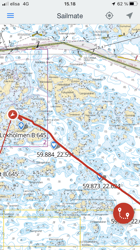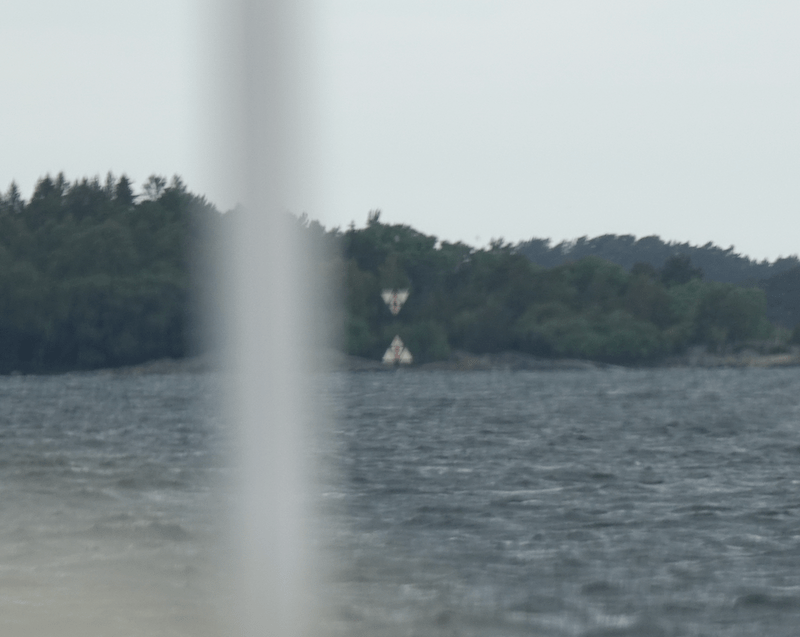 Matkalla oli yhdellä luodolla kolmio merkki ja vähän pidemmällä, kuvassa numeron B 645 kohdalla samanlaiset kaksi eli linjatauluja. Kuva otettu heiluvasta, liikkuvasta veneestä, kaukaa ja siksi ”vähän” epätarkka.