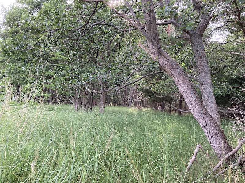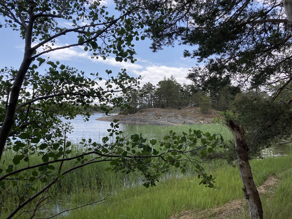 Tein pienen tutustumiskierroksen. Ensin vaikutti, ettei täällä kannata ollenkaan käpöstellä, liikaa heinikkoa ja sen myötä varma tapa saada punkkeja. Tämä niitty on suoraan etelään veneestämme.