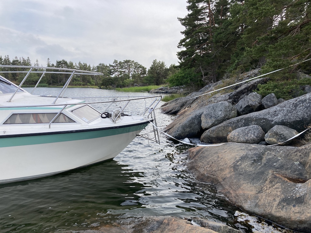 Iltapäivällä lähestyi vene hyvin määrätietoisesti, joten oletettavasti ovat ennenkin täällä käyneet. Saimme siis naapuriksi isohkon veneen. Suurin piirtein meidän ikäisiä ”nuorukaisia” 😉