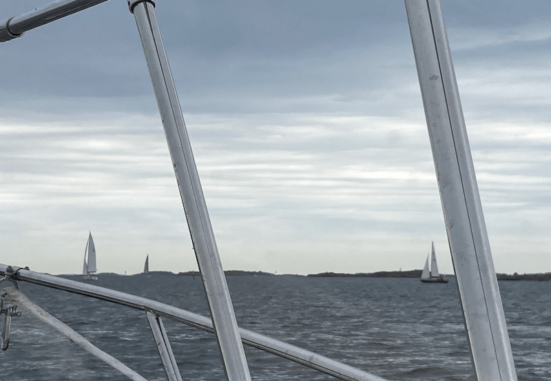 Oli vähän outoa, kun joutui ”väistelemään” muuta liikennettä. Nämä purjeveneet olivat tulossa Hangosta aivan siinä eteläkärjen kohdalla. Ilmeisesti eivät olleet kilpailuun osallistuvia. Saattaapi olla, että heidän oli lähdettäväkin, koska Regatalle oli varattu suurin osa Hangon itäistä satamaa.