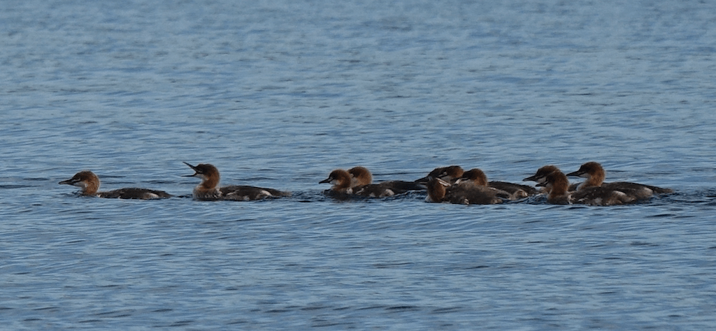 Koskelon porukka on lisääntynyt sitten viime näkemän. Tässä ei edes ole kaikki kun muutama jäi emon lisäksi kuvasta pois. Niillä oli kiireempi kuin näillä. Mitähän tuo toinen jonossa oikein rääkyy, kun tänne asti ei ääni kuulunut. Vai olisko saalistaan nielemässä? Nämä on aika velikultia kalastamaan.