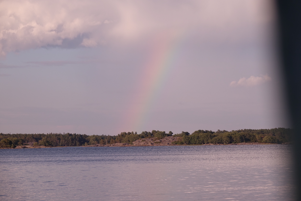 Mantereelta kuului ukkosen jyrinää. Meillä ei sen sijaan pilven hattaraakaan. Tuo pilvi ja sateenkaari on sitten todella kaukana. Jossain Bromarvin kohdilla, otaksuisin.