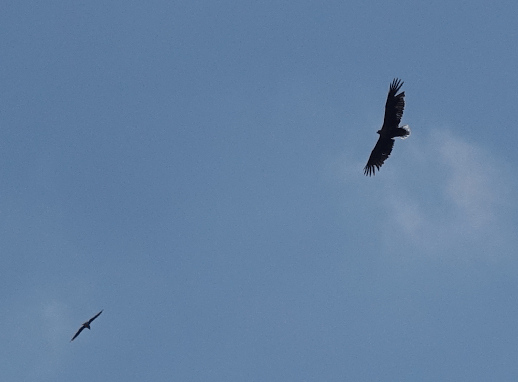 Aamupalan jälkeen huomattiin puoli vahingossa merikotkan liitelevän aika kaukana meistä. Minä tempaisin Sonyn käsiini ja otin aika monta otosta, joista pari kohtuullista. Vapaalla kädellä ilman tukea, jota heiluvasta veneestä ei kannata edes ottaa. Kun zoomaa melkein kaikki ”ulos”, niin ei tahdo oiken pysyä tuo käsi vakaana. Jos kamera heilahtaa millin, niin se on tuolla kaukana taivaalla kymmeniä senttejä. Sattui vielä mahtumaan merilokki samaan kuvaan. Tämä on rajattu ja suurennettu aika reilusti.