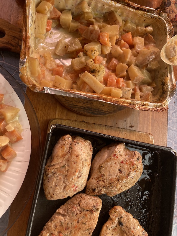 Nyt oli vuorossa broileria, kermaisia uunijuureksia ja kanttarelli-sipulipaistos.