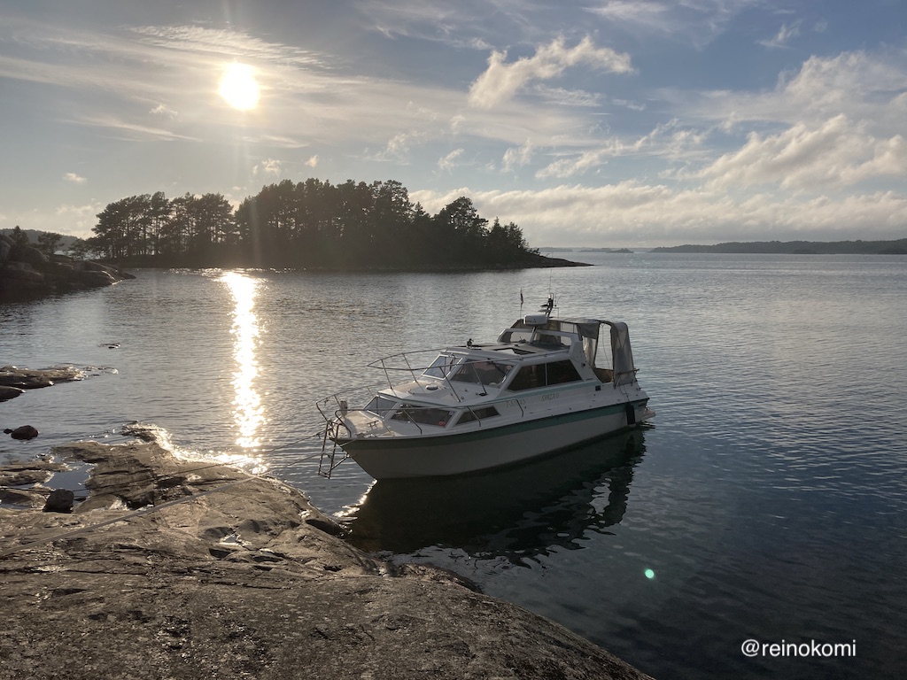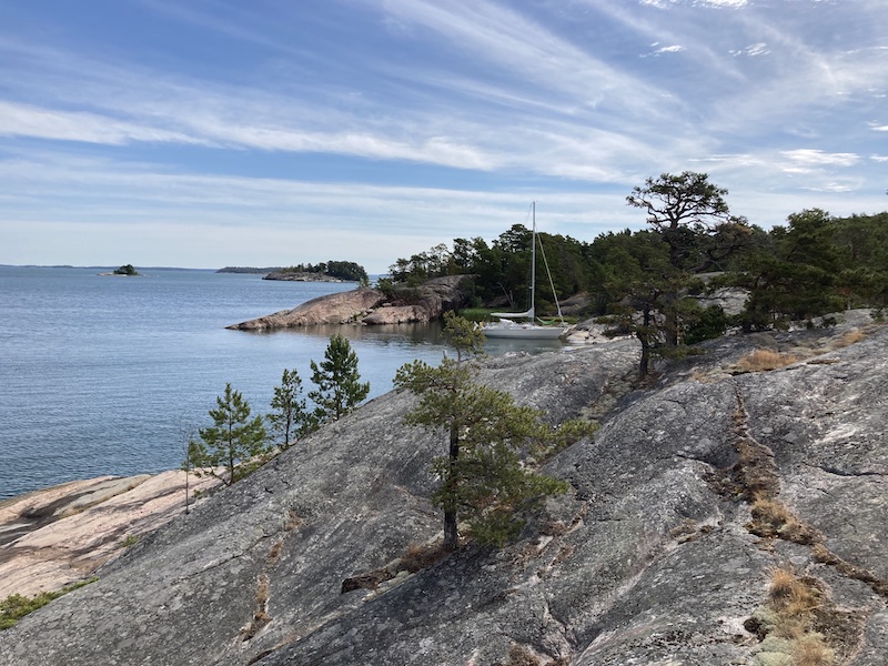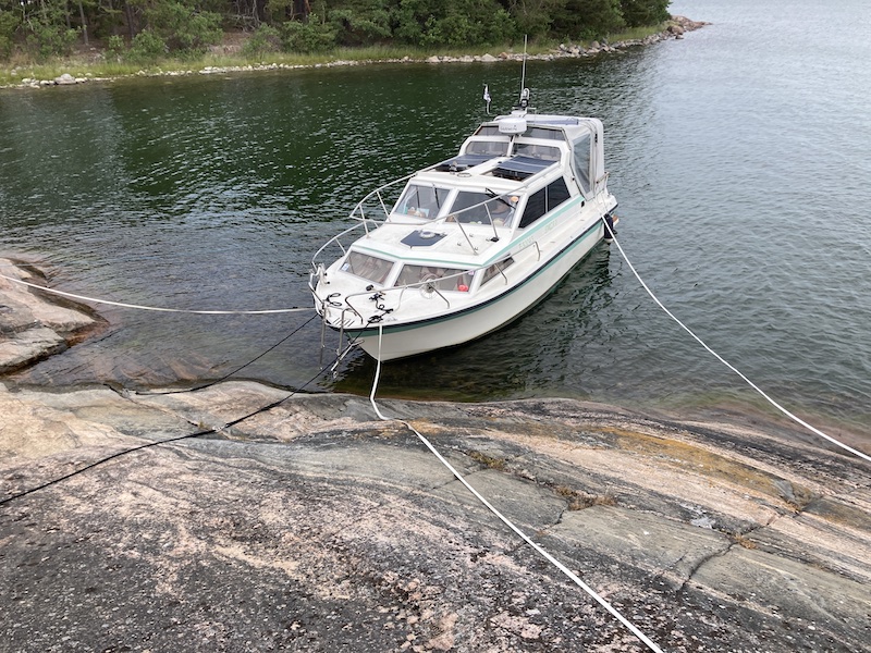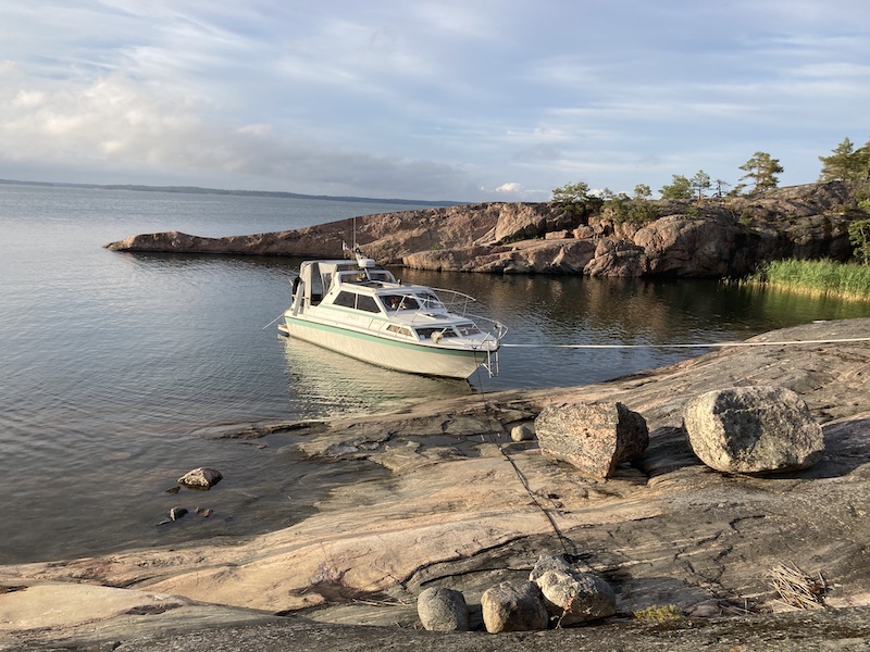 Aamulla tuuli jo aika reippaasti, joka oli kylläkin ennustettu. Olin laittanut kellon soimaan varuilta kahdeksalta, että kerkeisimme pois alta, ennen kuin oikeasti alkaa tuulemaan. Sen verran oli vene keikkunut, että yksi kolmesta kalliokiiloista oli irronnut. Jouduin siis hetken miettimään, mitenkä saisin voimakkaassa sivutuulessa irroittettua keulaköydät ja että vielä pääsisin itse takaisin veneeseen. Hyvin suuniteltu on puoliksi tehty, mutta nyt jouduin silti tekemään koko jutun ihan ite.