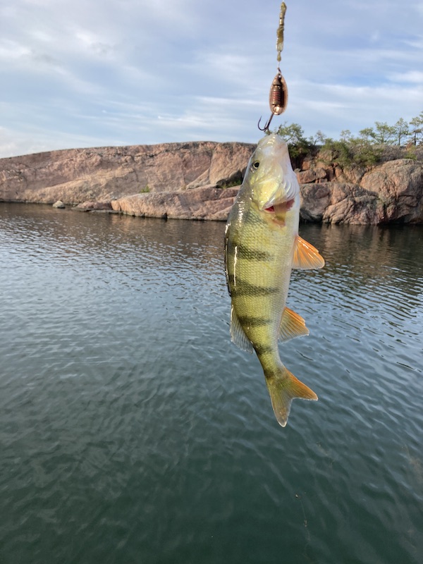 Tässä paikassa ei tarvitse käyttää kalliokiiloja. Puut ja kivet pitävät tämän kokoisen veneen kyllä paikoillaan. Pitkät köydet ja liinat tarvitaan. Kun olimme saaneet veneen haluttuun paikkaan ja oikealle etäisyydelle rannasta, päätin kokeilla, josko tässä olisi ahvenia jäljellä sitten viime käynnin. Olihan niitä. Kolmannella heitolla tuli ihan kelpokokoinen, mutta päästin sen vielä kasvamaan, kun oli niin siististi kiinni.