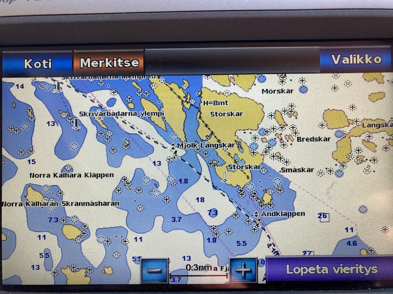 Ensin oli tarkoitus ajaa viralista väylää pitkin, mutta siellä oli yllättävänkin kookkaita aaltoja, joten muutin suunnitelmaa. Merellä pitää aina olla ”hihassa” plän B. Kökarista lähtee pohjoiseen myös sellainen katkoviivoilla merkitty väylä, jota nyt sitten noidatin. Sinne oli laitettu muutama viitta sekä kummeleita merkitsemään missä väylä kulkee. Ilmeisesti viitat eivät ole kauan olleet, koska niitä ei ole meidän merikartassa. Plotterin kartassa ne ovat. Mutta minähän päivitinkin tämän kartan täksi kesäksi. Edellisessä, vuodelta 2014 niitä ei ollutkaan, koska olemme ajaneet ennenkin tätä pitkin.