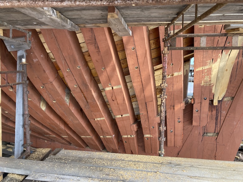 En ole ennen livenä nähnytkää tällaista rakennusurakkaa. Käsittämättömän hieno kokemus. Todella tuhdit kaaripuut, joihin kiinnitetään lankut molemmin puolin. Ei ollut mittaa mukana, mutta näytti olevan 5×6 tuumasia ja kaksi rinnakkain, joihin sitten 3×6 (tai 7) tuumasia lankkuja kiinnitetään.