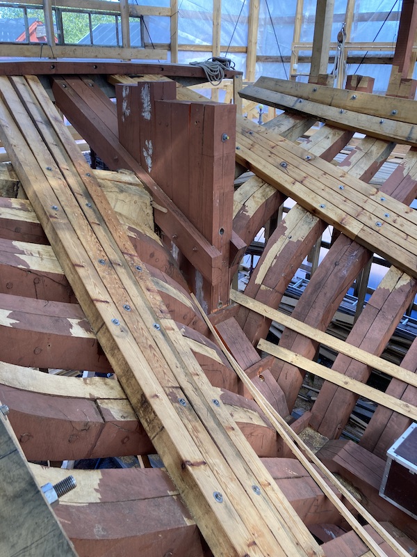 Kölipuiden viereen oli kiinnitetty lisää noita 5×6 lankkuja. Ulkona olikin sellaisia ”höyrystimiä” eli pitkiä laatikoita, joihin nuo lankut laitetaan lämpiämään ja sitten kuumina asennetaan että taipuisivat paikoilleen. Kovvoo hommoo.