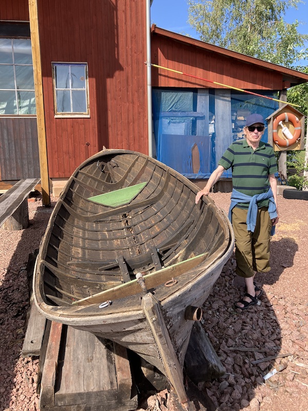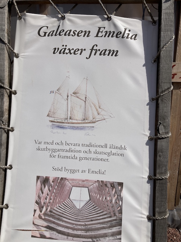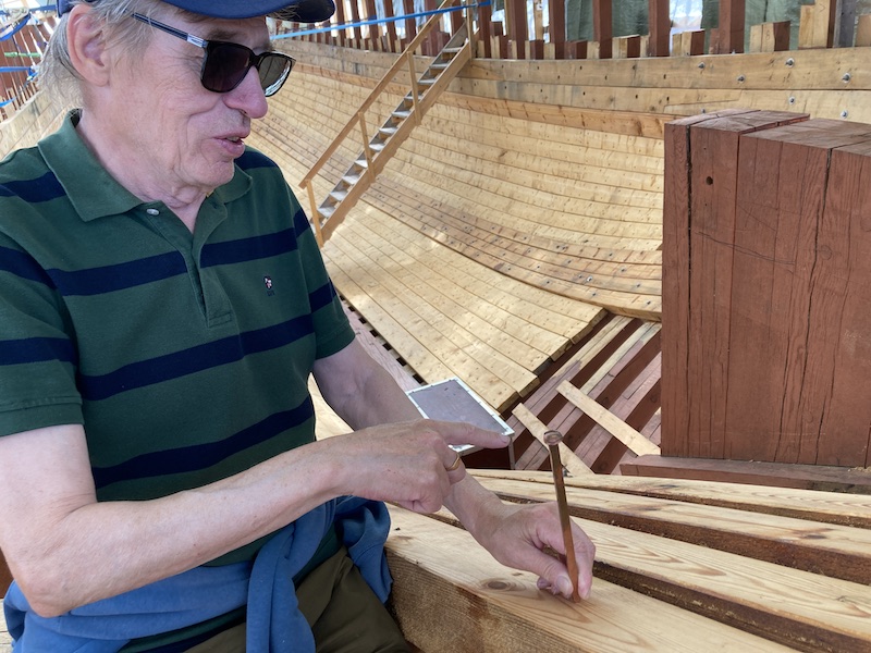 Ylempänä kiersi rakennustelineet ympäri laivan runkoa, joten pääsimme ihastelemaan tätä työtä joka puolelta. Vahinko vain nyt ei ollut ketään töissä. Ehkäpä silloin ei oltaisi päästy katsomaankaan? Ylhäällä oli ”näytillä” kupariniitti. Kokoa oli aika riittävästi, mutta niin on kohteellakin, mihin se niitataan. Tai sitten on ”vain” kuparinaula? https://www.emelia.ax/galeasen-emelia-vaxer-fram
