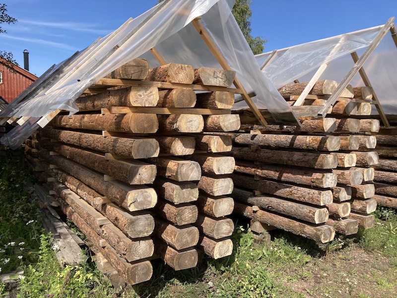 Projekti tarvitsee valtavasti puuta. Siksipä niitä on kuivumassa taapeleissa alueella. Oli täällä myös niita ”ohuempiakin” lankkuja, mutta tässä nyt sitä järeämpää tavaraa. Joku puuseppä on minulle aikoinaan kertonut, että vasta kolmen vuoden jälkeen noita voi käyttää, sitten ne eivät enää ”vetele” mihinkään suuntaan, kun niitä työstää. Nämä ovat ns tuppeen sahattuja.