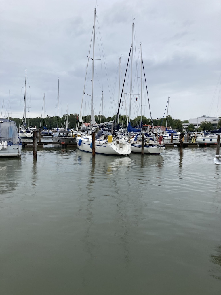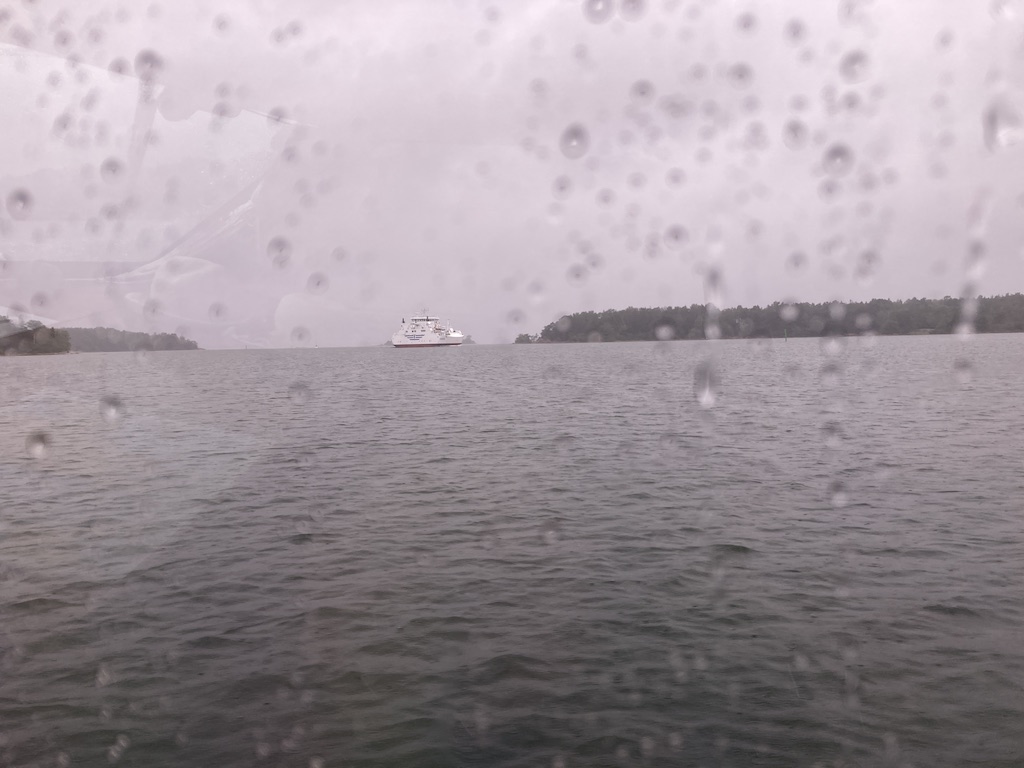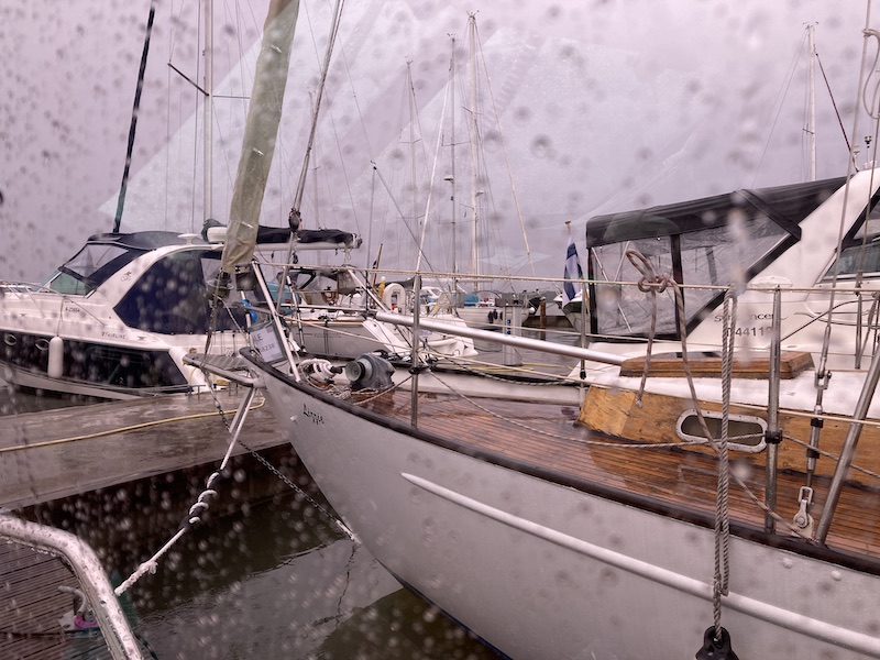 Ja niin saatiin loppumatkassakin vettä ja paljon. Välillä näkyvyyttä ei ollut kuin nimeksi. Tutkakin menee ”tukkoon”, koska luulee, että edessä on este. Nelisen mailia ennen Satamaa hidastin vauhtia, koska sade ei näyttänyt loppuvan. Ajatuksena oli lillua sataman edessä ja odotella sateen loppumista. Sitten alkoi tulla taaksemme veneitä, joten oli ”pakko” mennä ”sisään”. Ja onneksi menimme, koska saimme viimeisen aisapaikan. Muuten olisimme joutuneet taas niiden inhoittavien tolppien väliin. Sateessa jouduttiin Sarzan köydet laituriin kiinnittämään.
