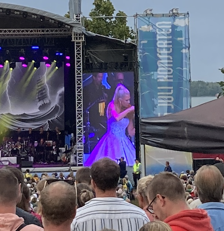 Vasta sitten uskaltauduimme lähtemään kaupungille. Käytiin pizzalla Diablossa ja sen jälkeen kävelykadulla ihmettelemässä vilskettä. Täällä on musiikkiviikojen aikaan tosi paljon illallakin porukkaa. Menimme musiikkilavan läheisyyteen ja silloin kuulin, että on olemassa myös ilmaiskonserttipaikka. Kirjaston ja satamamme läheisyydessä, toisessa suunnassa varsinaista maksullista paikkaa. Siispä sinne. Kunkas ollakkaa, niin seuraava esiintyjä saapuessamme paikalle oli Linda Lampenius.