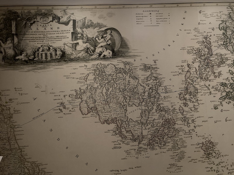 Vanhasta kartasta oli tehty iso suurennos seinälle. Kartta on vuodelta 1789. Käsittämättömän tarkka. Millä ihmeen ilveellä sen aikaiset ihmiset ovat pystyneet noin tarkan kartan piirtämään sen aikaisella tekniikalla? Saariin oli tehty merkkejä, joilla viestitettiin, mitä saarella on.