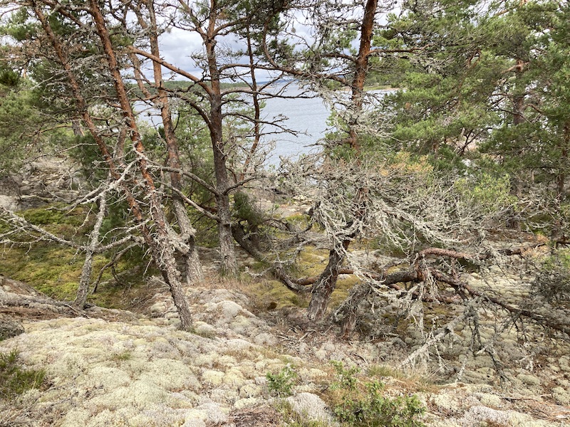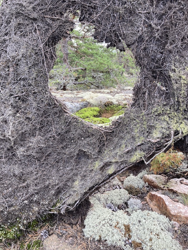 Saarella on tosi paljon tuulenkaatamia puita. Ja melkeimpä kaikki juurineen. Kallioon kun ei voi kovin syvälle edes juuret mennä. Olipa yhteen juurakkoon reikä jäänyt. Päätin täyttää sen harmaalla ja vihreällä 😉