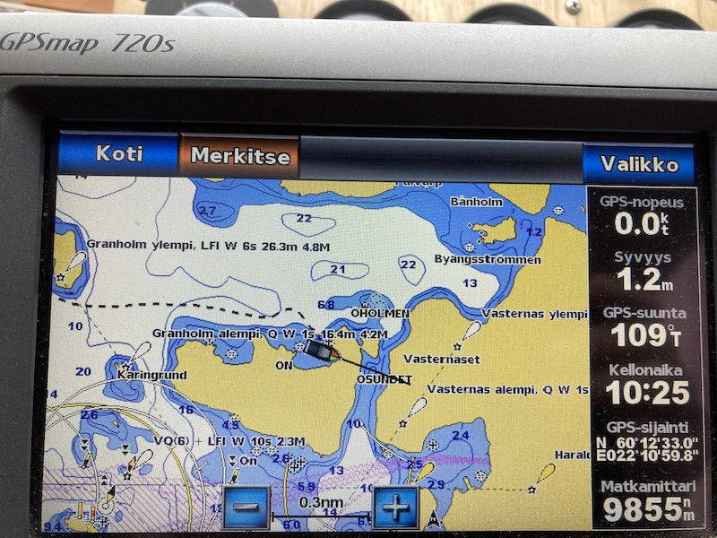 Ensin meinattiin olla pari yötä Seilissä, mutta muutimmekin mielemme ja siirryimme pikkaisen länteen päin. Ön (Öjen) saari on meille entuudestaan tuntematon. Valitsin tämän suojaisan paikan tuulen kääntyessä itään. Se olisi käynyt ikävästi suoraan Seilin satamaan.