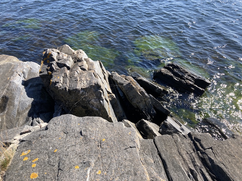 Saari ei ole oikein lenkkeilijän paratiisi. Ja kun vielä joka paikka oli märkänä, en viitsinyt edes koitaa mennä tuonne niemen keskellä olevalle kalliolle. Vasemmalla, aivan niemen kärjessä näyttäisi olevan syvä ranta, mutta samalla myös aika jyrkkä kallio mennä maihin. Meidän valitsemalla kohdalla on loiva kallio maihin nousua ajatellen.