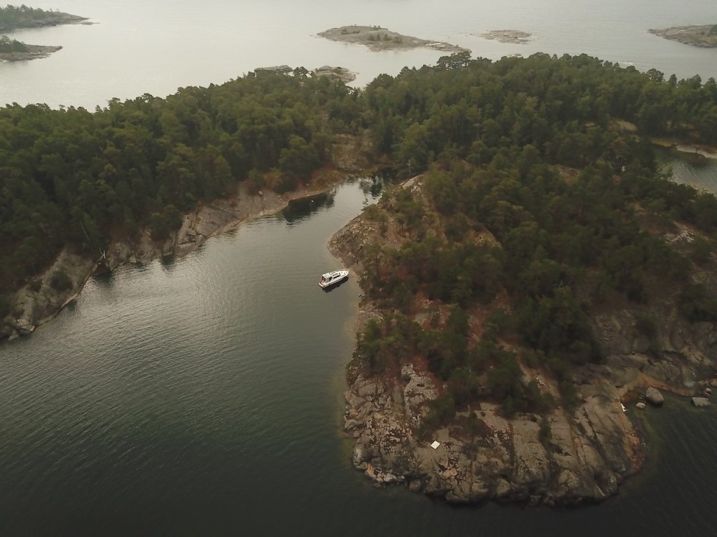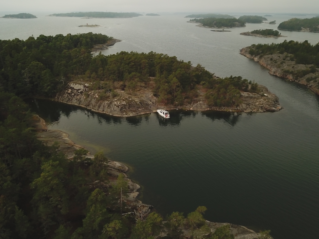 Matkalla tänne kiersimme Algen saaren. Alimmillaa vettä tuolla kierroksella oli 6 metriä. Algenin länsikärjessä vettä oli 14 metriä, vaikka kartta väitää sen olevan alle 10. Vasta tässä rantautumisvaiheessa vettä ei ole kuin kolme metriä, joten hyvin tänne voi vaikka purkkarilla tulla. Veneemme perässä vettä vähän yli kasi metriä.