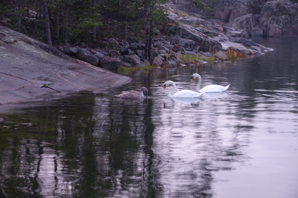 Illalla joutsenperhe kävi ruokailemassa veneemme vieressä. Otin ikkunan läpi kuvan ja siksi vähän epätarkka.