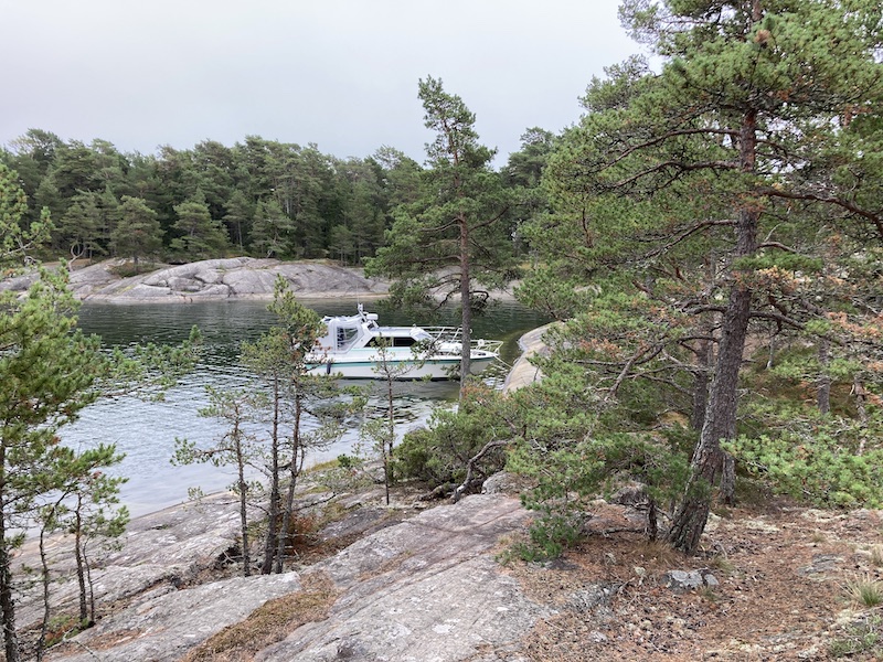 Tässä toivottavasti saadaan olla tuulilta suojassa. Kalliossa kiva pieni tasanne aivan Sarzan keulan edessä, joten maihinnousu on helppoa.