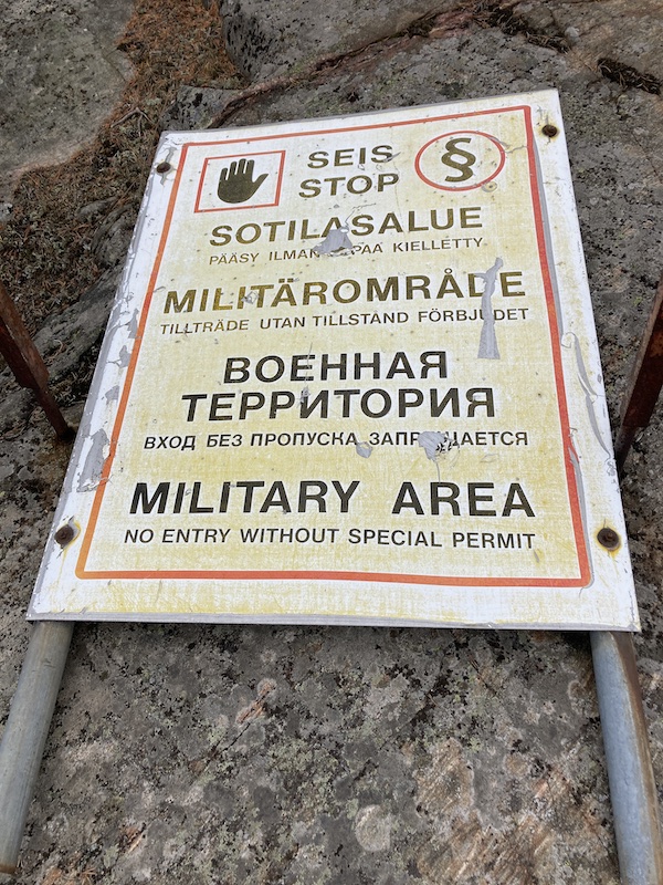Myöhemmin kävelylenkillä huomattiin, että aivan hyvin olisi voinut ajaa tuosta kapeikosta. Missään kohtaa ei pohjaa näkynyt korkealta kalliolta. Siellä korkealla kohdalla, saaren pohjoiskärjessä oli kaadettu puolusvoimien kyltti. Tämäkin saari ollut aikoinaan armeijan käytössä kuten alueella monet muutkin saaret.