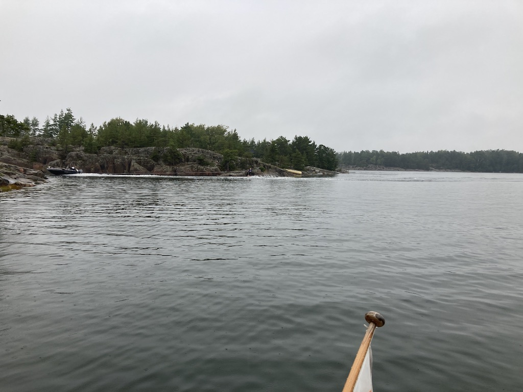 Aamulla tuuli oli jo kääntynyt länteen, vaikka piti vasta iltapäivällä sen tehdä. Niinpä päätimme mennä saaren toiselle puolelle, ainakin melkein. Plotterin kuvassa merkitty viimeöinen paikka.