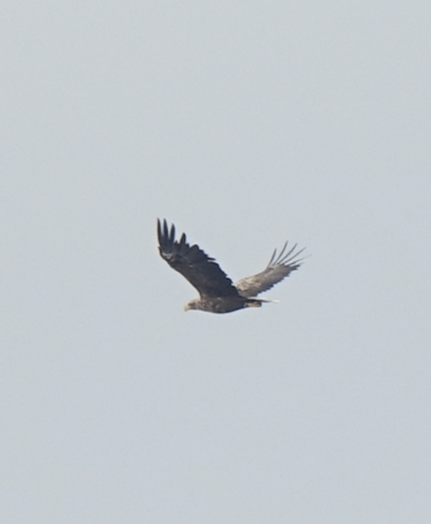 Tässä pyöri joku pieni haukka, josta en saanut kunnon kuvaa. Sen sijaan merikotkasta jonkinlaisen sain. Oli julmetun kaukana ja siksi suurennos vähän rakeinen.