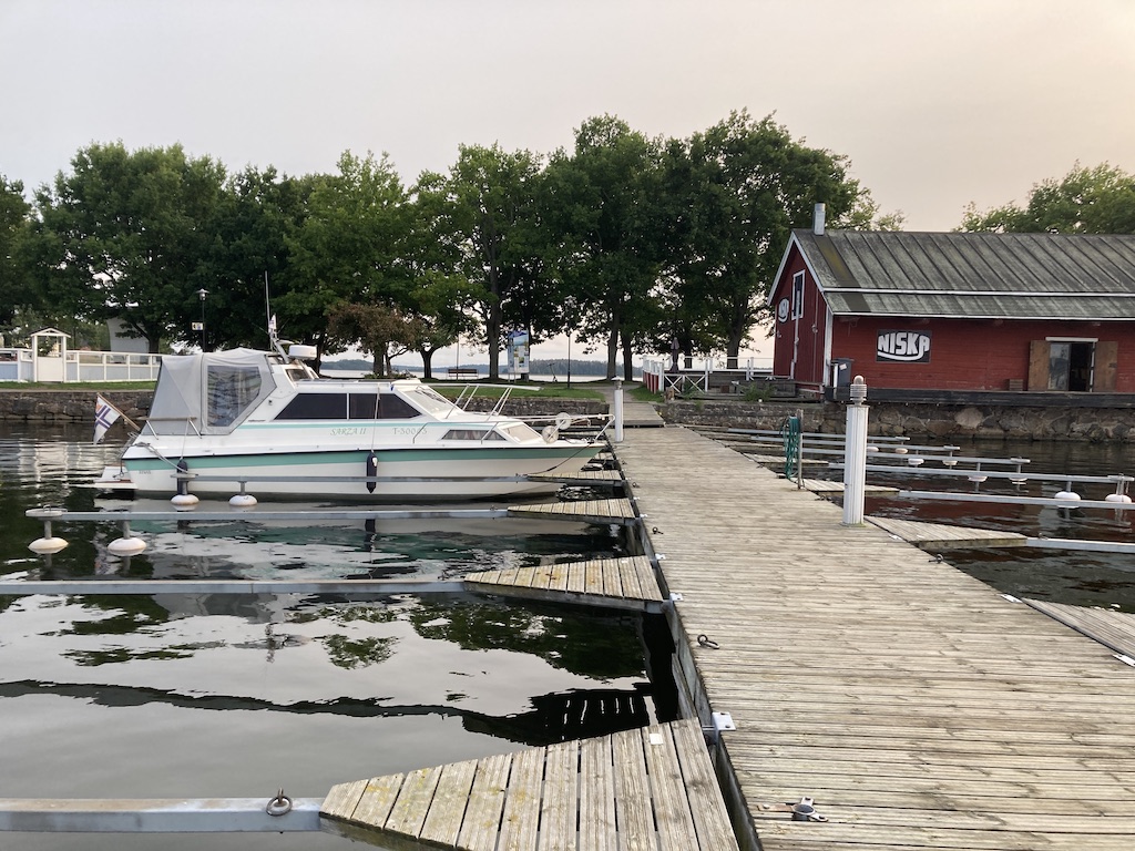 Sarza pääsi melkein ”omalle” paikalle. Viereiseen. ”Oma paikka” oli varattu. Satamassa ollut ilmeisesti tunkua, kun vieläkin oli näin paljon veneitä jäljellä.