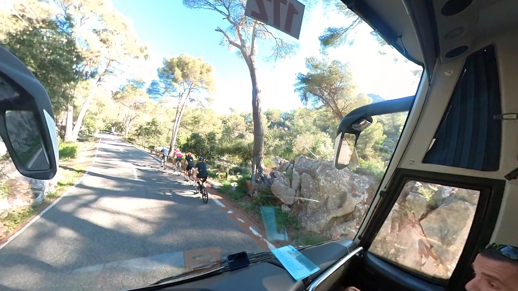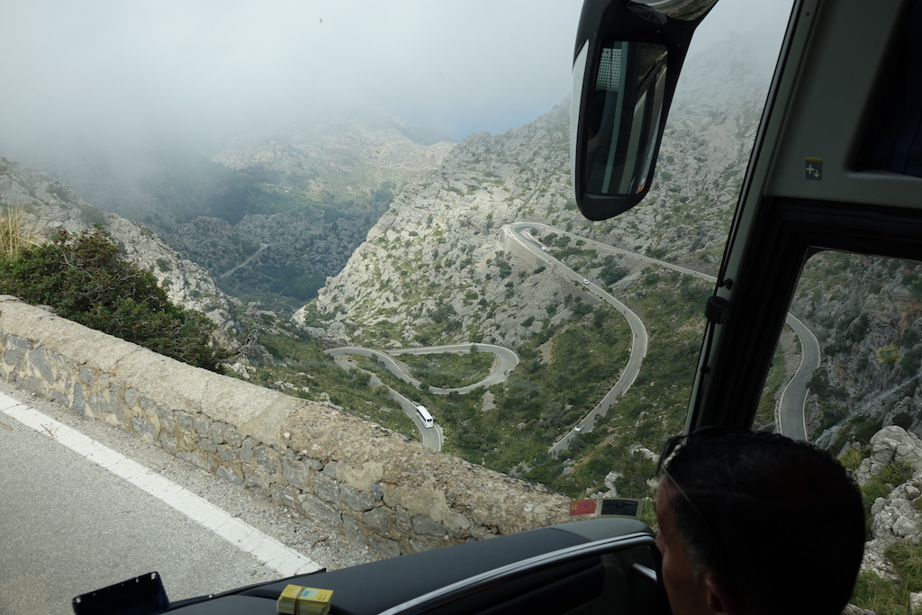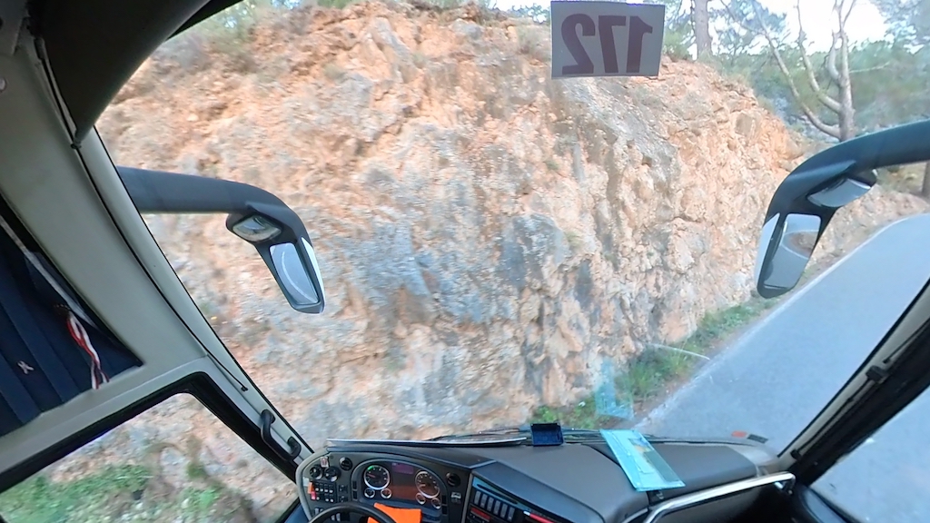 Välillä peilit melkein koskettivat kalliota tiukoissa mutkissa. Pyöräilijät suhasivat milloin miltäkin puolelta bussia ohi. Kuski sai olla tarkkana.