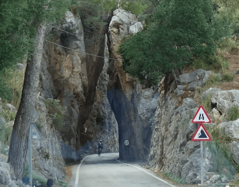 Upean luonnon halkeaman läpi tiellä kulki myös pyöräilijä. Ja pakko oli mennäkin jos rannikolle halusi päästä. Alamäki oli pitkä ja niinpä tiukemmissa mutkissa fillaristit suhasivat bussin ohi välillä kummaltakin puolelta.