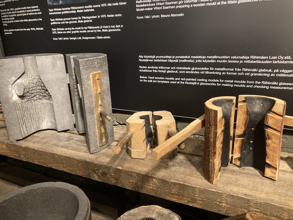Aikojen saatossa opittiin tekemään sarjatuotantoakin. Silloin piti ottaa muotit käyttöön. Tässä vasemmainen on yhden Finlandiapullon muotti ja pari muuta taitaa olla maljakoiden tekoon tarvittavia apuvälineitä.