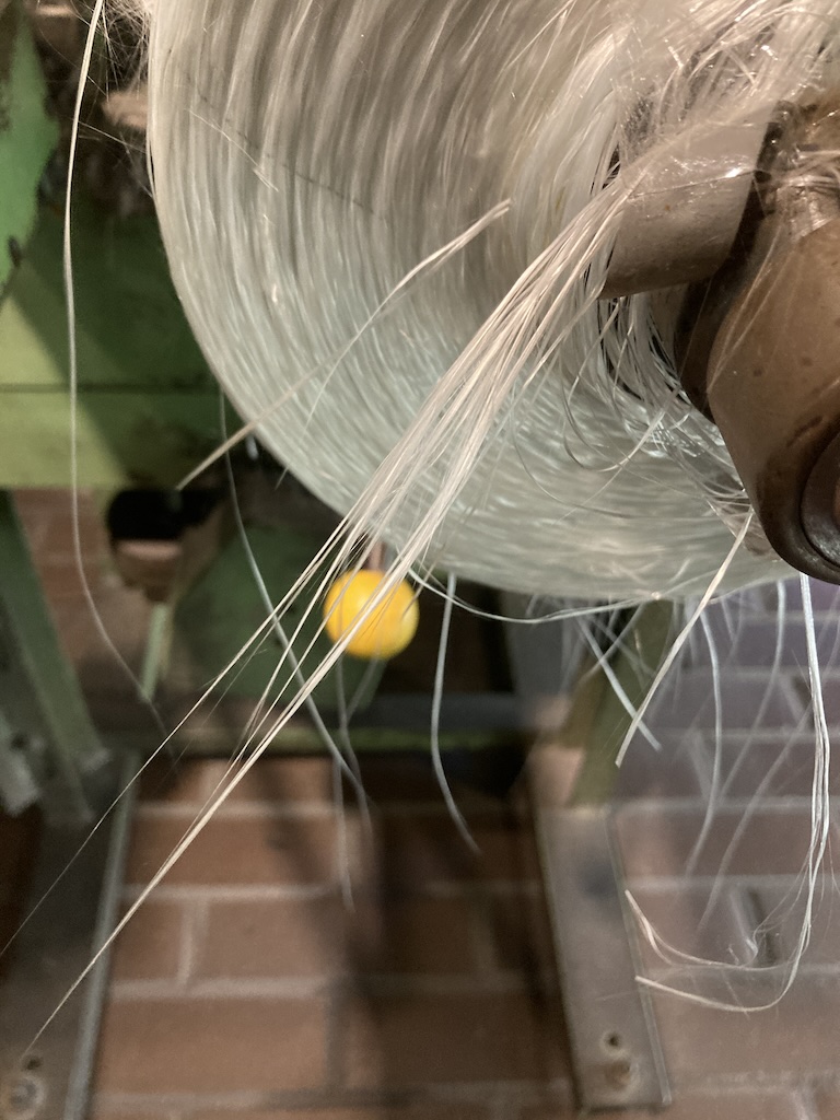 Tällaisella ihmeellisen näköisellä koneella saadaan aikaiseksi todella ohutta kuitua aikaiseksi, josta sitten punotaan varsinaista lasikuitumattoa. Kuulemma lasimassaa venytetään tarpeeksi, jolloin tämä ohuen ohut kuitu valmistuu.