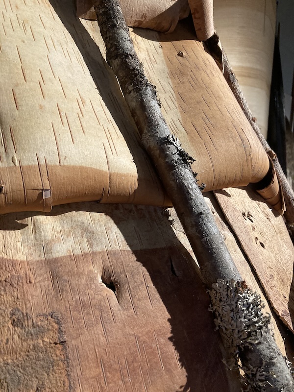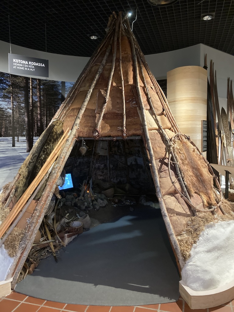 Metsämiesten entisaikojen kota, joka oli päällystetty koivun tuohilla ja ja eristeeksi heiniä ja risuilla sekä kepeillä tyettu koko hökötys. En ollut moista koskaan ennen nähnyt. Yleensähän nämä ovat eläinten nahoilla vuorattu, joten ilmeisesti etelän miesten tekosia 😉 Hyvin varmaan asiansa ajanut. Mutta on siinä koivuja saanut repiä.