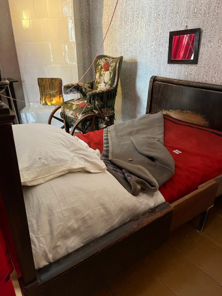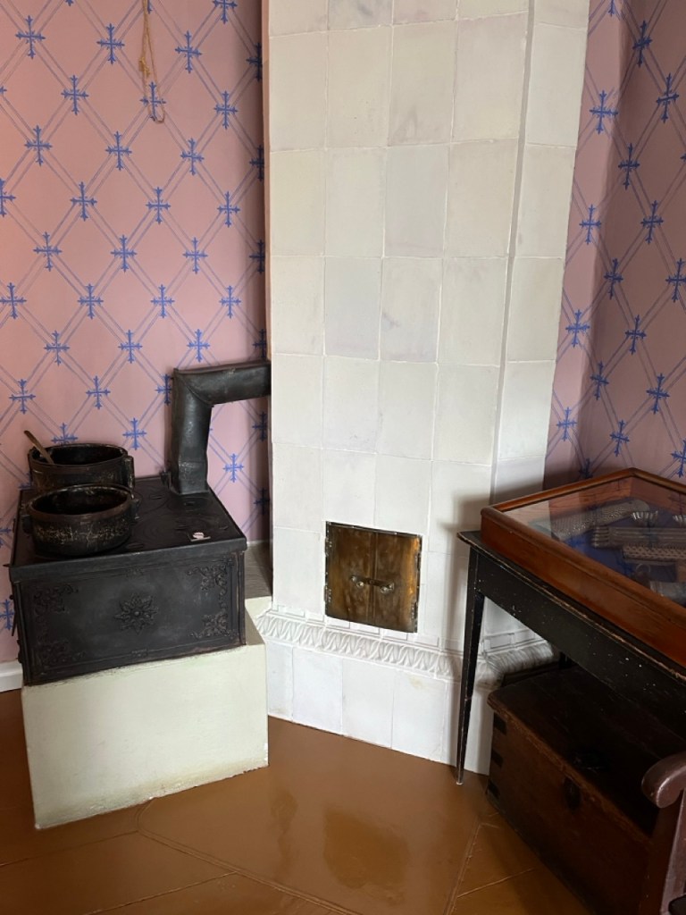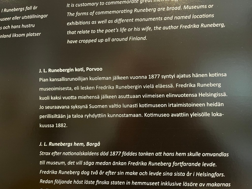 Kun olimme tässä museossa, meille kävi tuuri. Oli alkamassa opaan kertomus talon historiasta ja perheen tavoista asua täällä. Olisi paljon jäänyt tietoa saamatta ilman tätä esitelmää. Esimerkiksi, kun Runeberg sai aivohalvauksen ja kun alkoi siitä vähän kirurgi-poikansa ansiosta toipua, hänelle tehtiin pyörätuoli, jolla sitten hän pystyi liikkumaan talossa. Sitä ennen kynnytkset poistettiin kaikkialta. Valitettavasti hoito jäi kuulemma vähän kesken, koska pojan oli palattava Helsinkiin hoitamaan vakanssiansa.