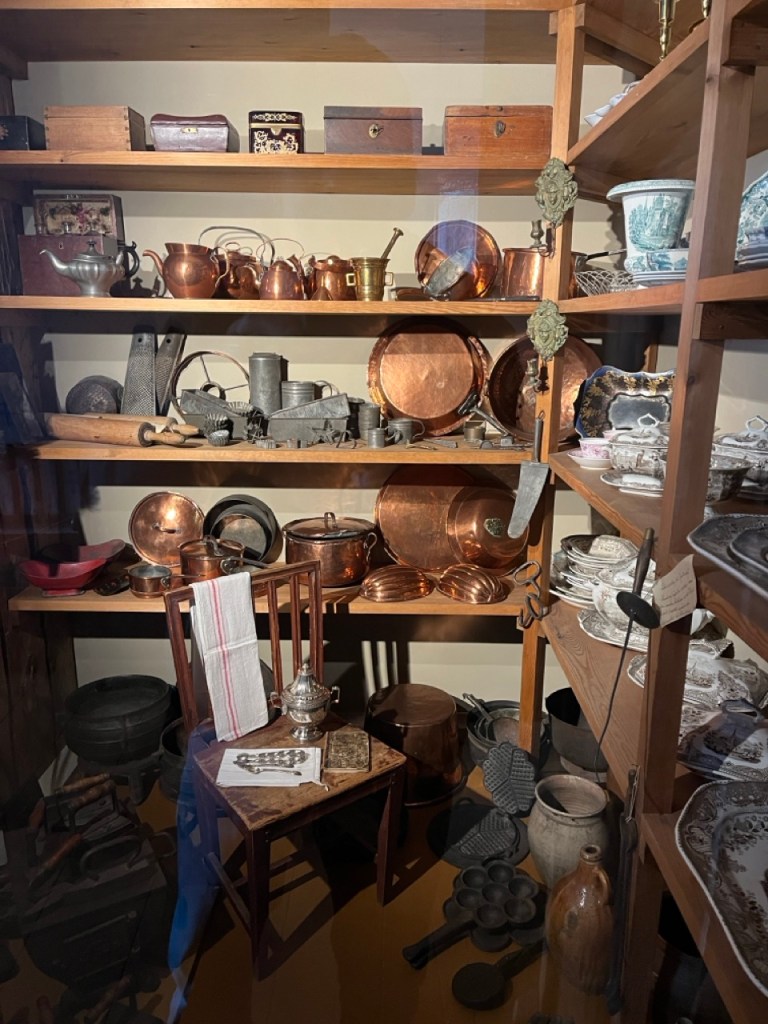 Oli aika hienot ja arvokkaa keittiövermeet. Olisi huutokauppakeisarin kuparipannuja useampikin hyllyssä.