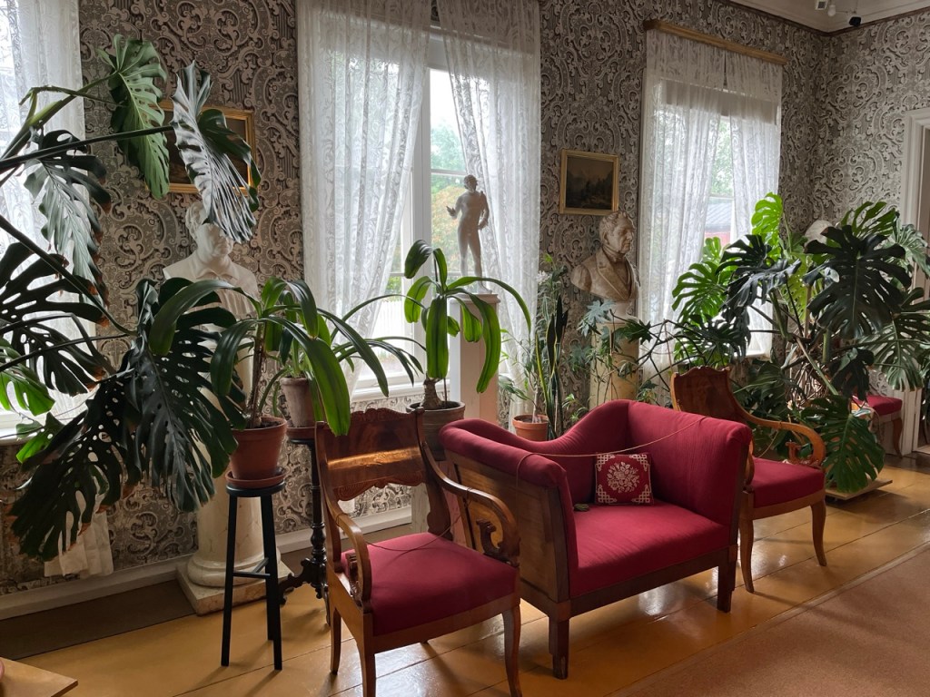 Oleskeluhuoneen kalustoa ja viherkasveja. Kasvit olivat emännälle niin tärkeitä, että otti osan mukaansa, kun lähtivät kesää viettämään saaristoon. toisessa soutuveneessä matkustivat isäntä ja pojat ja toisessa sitten emäntä ja kukat.