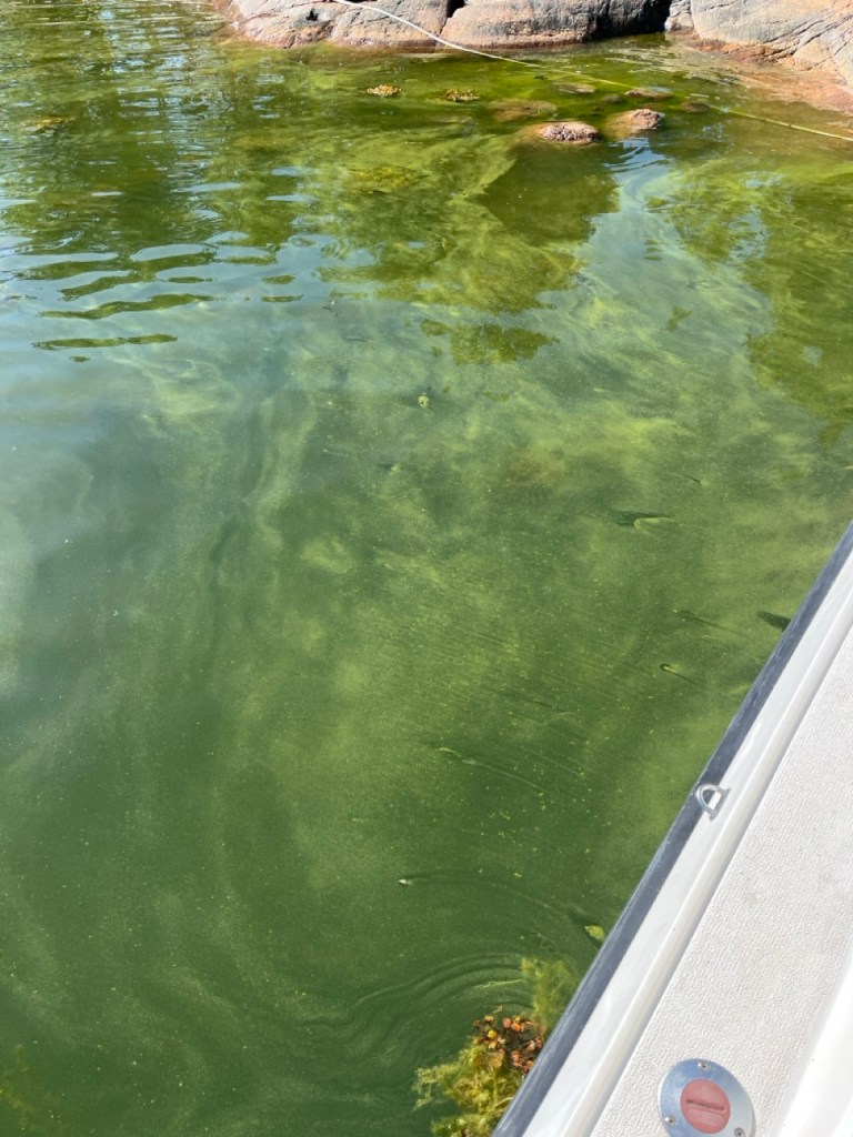 Aamulla oli kehittynyt aika pahasti sinilevää. Täällä Porkkalan perukoille siis tällaista. Lähdemme pois.