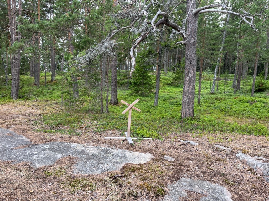 Viime vuonna täällä ollessamme saaren omistaja kävi ihmettelemässä meitä. Oli kuulemma suivaantunut vieraileviin veneilijöihin. Vievät kuulemma metsästä kaikki puut? Nyt olikin ukko laittanut merkin, mistä pidemmälle hän ei toivo vierailijoiden menevän. Enempi muistuttaa jätkäristiä kyseinen kieltomerkki.