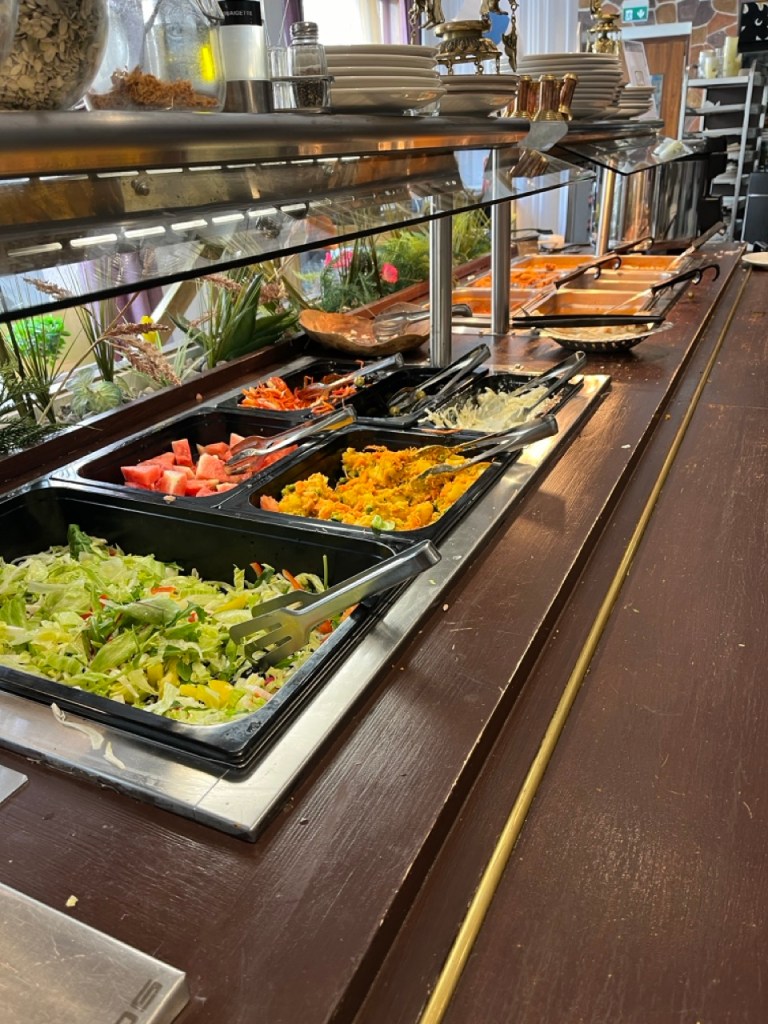 Oli useampi lämmin ruokalaji alkusalaattien lisäksi.