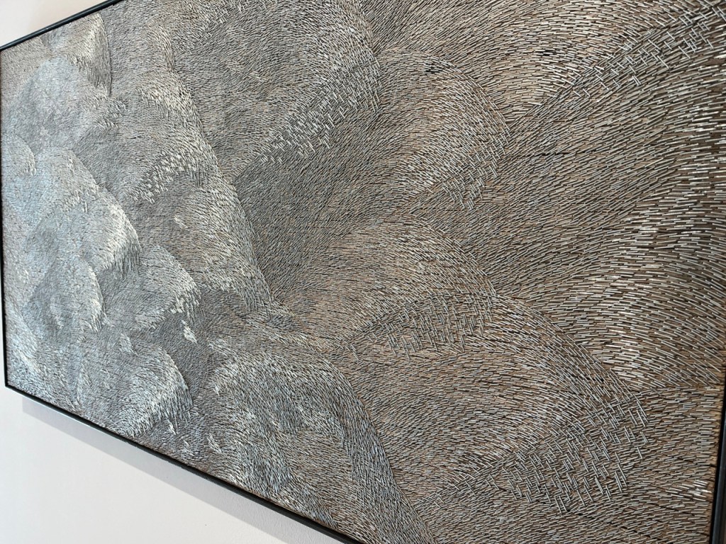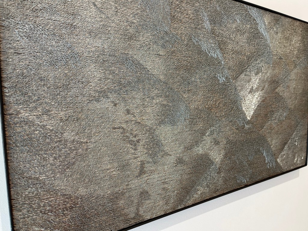 Mutta yksi mielenkiintoisimmista töistä on tämä puulle ammutut niitit. Vaihtoi väriä ja ilmettä kun vaihtoi katsomiskulmaa.
