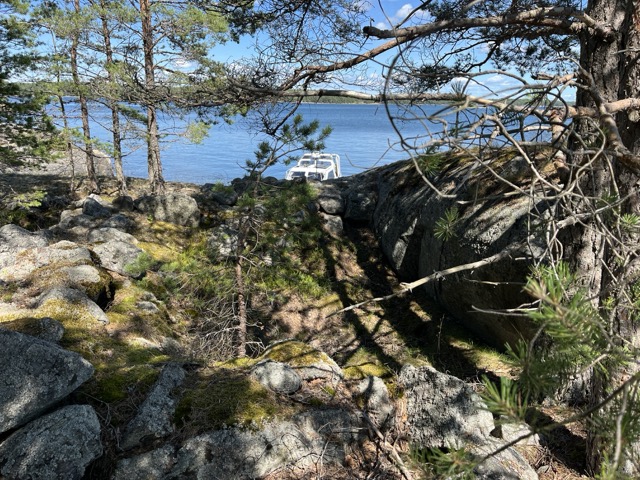 Tutkailin pikkaisen alueen historiikkia, koska tuossa veneemme etupuolella saaressa on ilmeisesti sodanaikainen tuliasema.