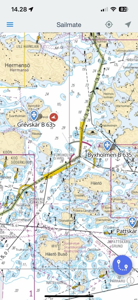 Kuvan kaappaus merikartasta ja siinä olemme punaisen täplän/nuolen kohdalla.