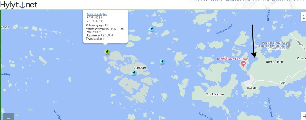 Alueella on jonkin verran myös hylkyjä. Kuten kaikkialla rannikoillamme. Mutta tämän hylyn tarina on aika mielenkiintoinen. Nuoli osoittaa Sarzan ja tämän Nötholmin sataman paikan.