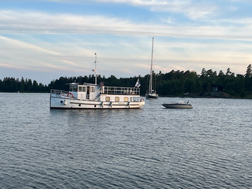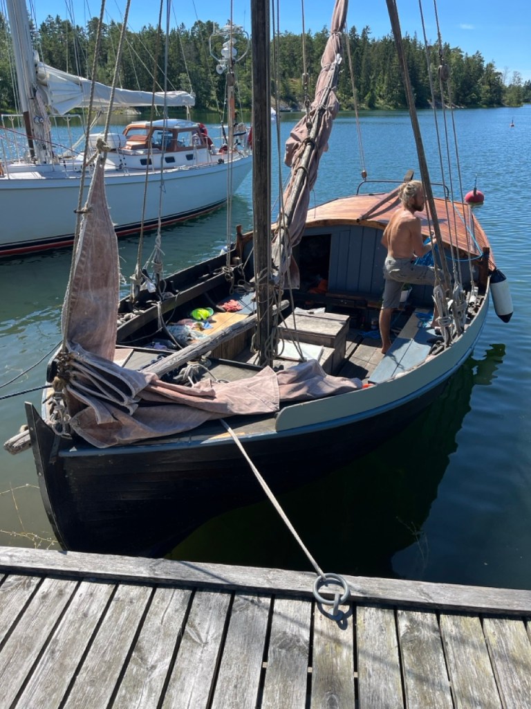 Menin jututtamaan kipparia ja selvisikin äänetön saapuminen. Veneessä on sähkömoottori ja akusto, joka riittää noin kuuden tunnin ajoa kolmen solmun nopeudella. Tulivat lataamaan akkujaan. Ihana tervan tuksu tuli laiturille asti. Kajuutan katto oli kuulemma tervattu vasta viikko takaperin ja siksi voimakas tuoksu.