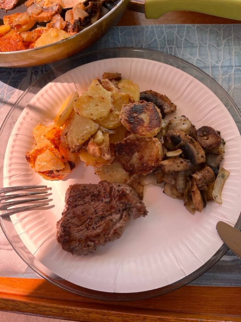 Meillä oli melkeimpä juhla-ateria ilman sen kummempaa syytä. Valkosipuliperunat naudan sisäfileen kera. Herkkusieni kevätsipulipaistos kyytipoikana.