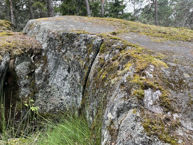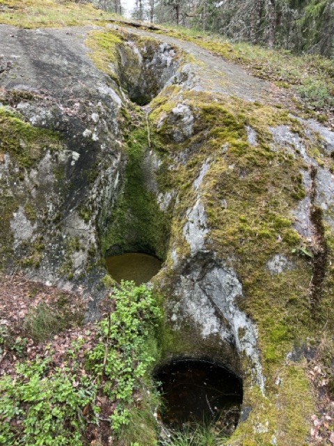 Siispä nousimme pienen mäen päälle ohi parin vuokramökin ja parkkipaikan. Opaste kertoi tieltä n 40 metrin päässä olevista ”montuista”.