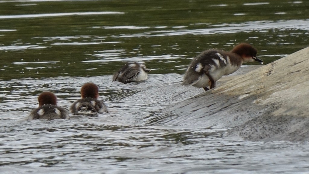 Jossain vaiheessa lintupoikuekin pyörähti lähellämme. Kovasti ovat arkoja. Pienikin rasahdus ja emo komentaa katraansa kauemmas. Yksi poikanen oli kalankin saanut, mutta kuvani epäonnistui tärähdyksestä, joten ei ole julkaisukelpoinen.